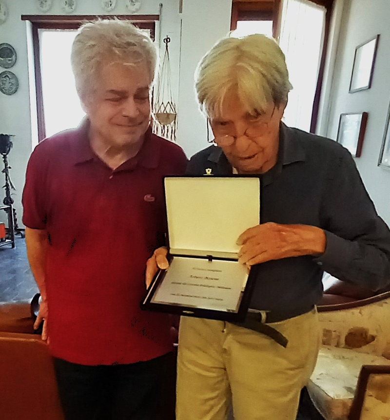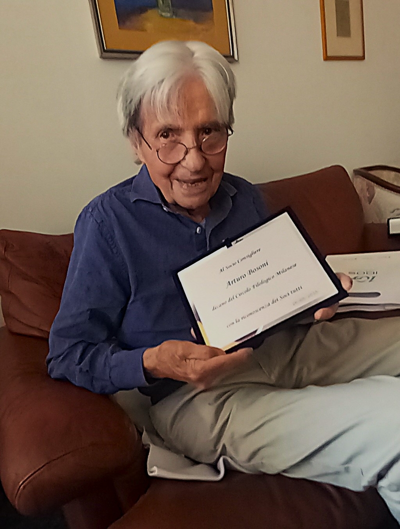 Consegna della targa ricordo ad Arturo Bosoni, Consigliere decano del Filologico, in occasione del 100° compleanno il 26 maggio 2025, con il Presidente M° Premuroso