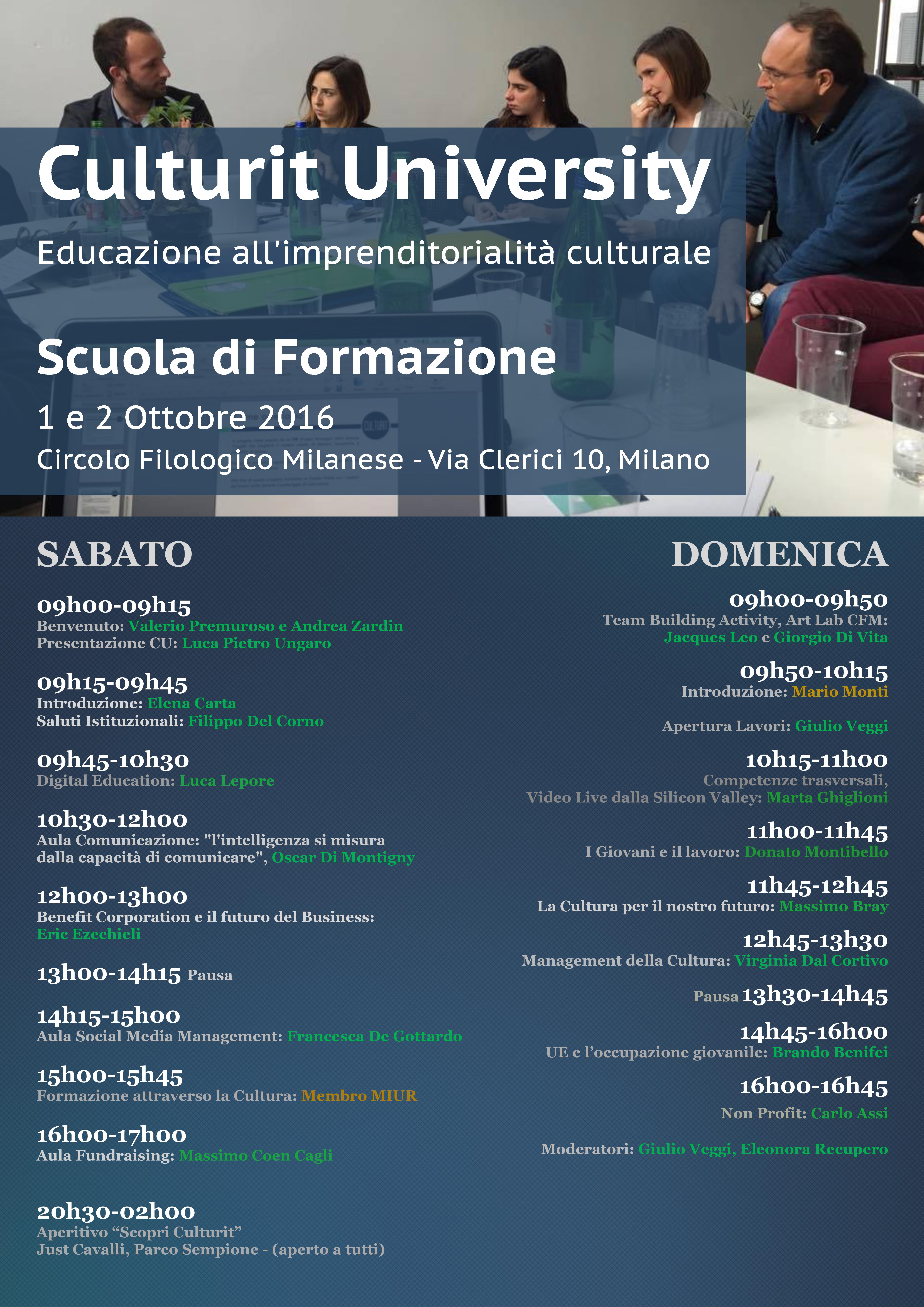 Sabato 1° ottobre 2016 dalle ore 9 alle ore 17 e domenica 2 ottobre 2016 dalle ore 9 alle ore 16,45 presso la ns. Sede convegno a cura di Culturit University Educazione all’imprenditorialità culturale - Scuola di Formazione